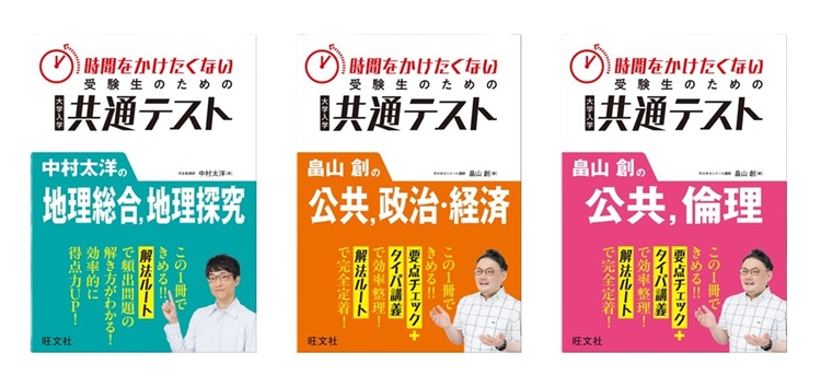 教育出版の株式会社旺文社(東京都新宿区/代表取締役社長 粂川 秀樹)は、「時間をかけたくない受験生のための共通テスト」シリーズとして、『中村太洋の地理総合,地理探究』、『畠山創の公共,政治・経済』、『畠山創の公共,倫理』の3点を9月22日(月)に刊行いたしました。