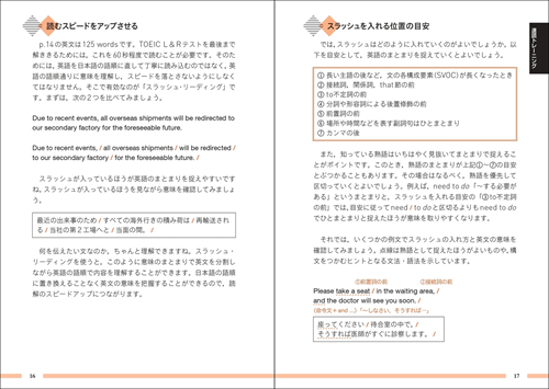 本編では、比較的取り組みやすいPart3・4形式の英文から、長文読解が求められるPart 7へと無理なく進めるステップアップ構成を採用。さらに、全てのパッセージには英語を意味のまとまりで捉えるための「スラッシュ」を入れ、トレーニングの学びを定着させます。ただ速く読むだけでなく、ページ下のQ&Aで内容理解をしっかり確認。「速読」と「精読」のバランスを意識した設計で、スコアを押し上げます。