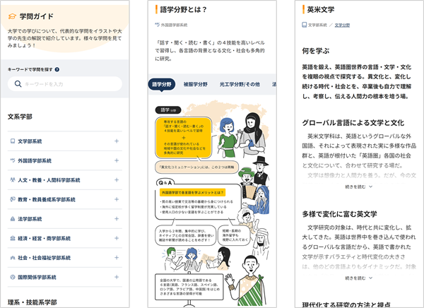 大学で学ぶことができる学問分野について、様々な大学の専門の先生による解説やイラストでわかりやすく紹介するコンテンツです。18学部系統、66分野、代表的な約90学科の情報を網羅しており、各学問がどのような学びで、社会とどう繋がっているのかを直感的に理解することができます。