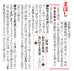 ・「基本義」欄…重要な助詞・助動詞に欄を設け、核となる意味を説明