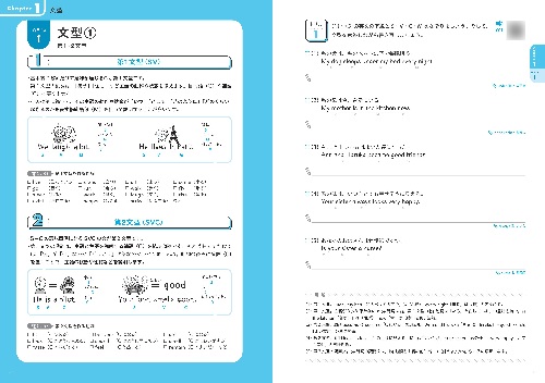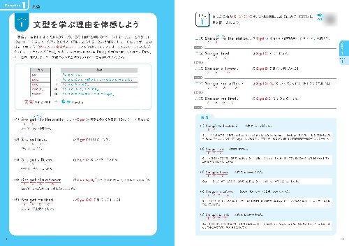 6つのChapter、35のUnitで、確実に力がつきます。各Unitは、イラストや図表を使った解説とドリル1-3の4ページ構成で、ドリル1が「基礎」、ドリル2・3が「応用」となっています。類似した英文に何度も触れられる構成で、順番にドリルに取り組むと自然と反復学習ができるつくりです。