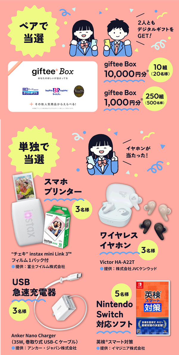 プレゼントは260組(520名様)にデジタルギフト「giftee Box®」、さらに14名様にスマホプリンタやワイヤレスイヤホンなどの豪華賞品が抽選で当たります。