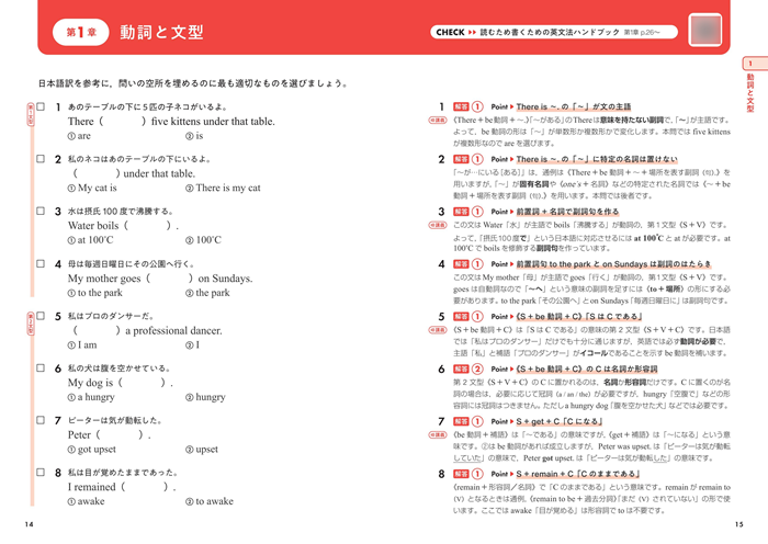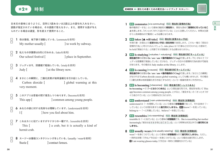 約1200問の問題はすべて空所補充型の短答記述問題で、「それぞれの文法項目のどの知識が足りていないのか」を端的に把握することができます。また、左ページで問題を解き、右ページで解答と解説を確認できる構成であり、解答・解説には別解やよくある誤答例も示してあります。