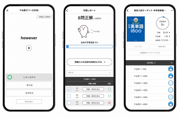 本機能の第一弾として、高校入試の頻出項目を効率よく「でる順」に学習できる、「高校入試 でる順ターゲット」シリーズ(計6冊)に対応。書籍で覚えた内容をアプリの3択問題で手軽にチェックできるため、スキマ時間でも学習が可能です。
