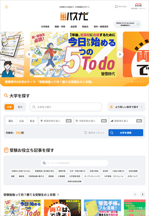 大学選びの記事や、資料請求、過去問など、受験対策に役立つ情報が満載です。