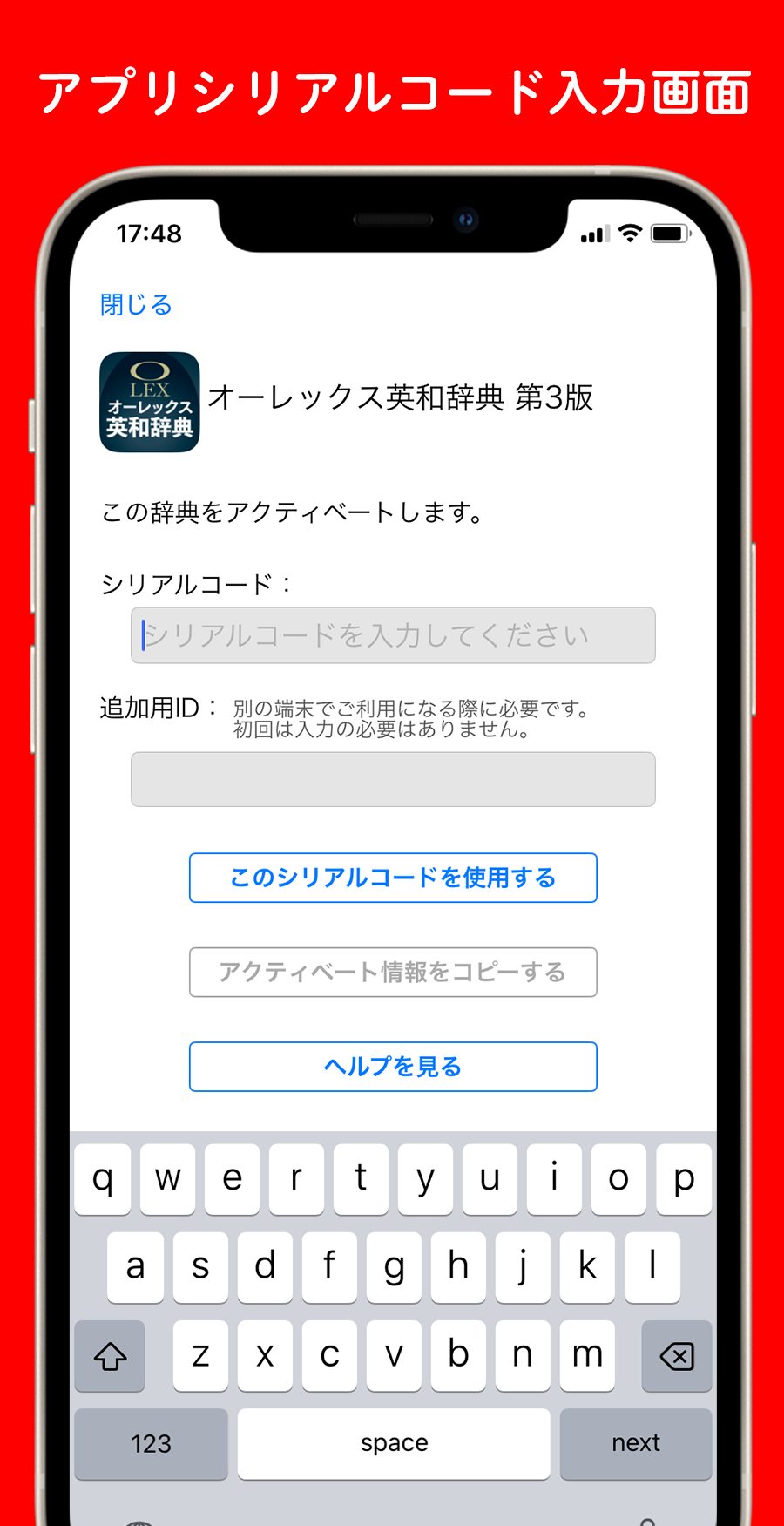 「追加用ID」は異なる端末でアプリを使用する際に、書籍のシリアルコードと一緒に入力する必要があります。初回アクティベート時に自動で割り振られます。